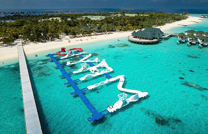 Надводные виллы «+ Slide» в Siyam World Maldives дополнены небольшими горками, спускающимися в океан. Но признанным чемпионом по количеству, высоте и крутости горок является Soneva Jani: там лихие водные горки установлены при виллах, детском клубе и надводном комплексе The Gathering.