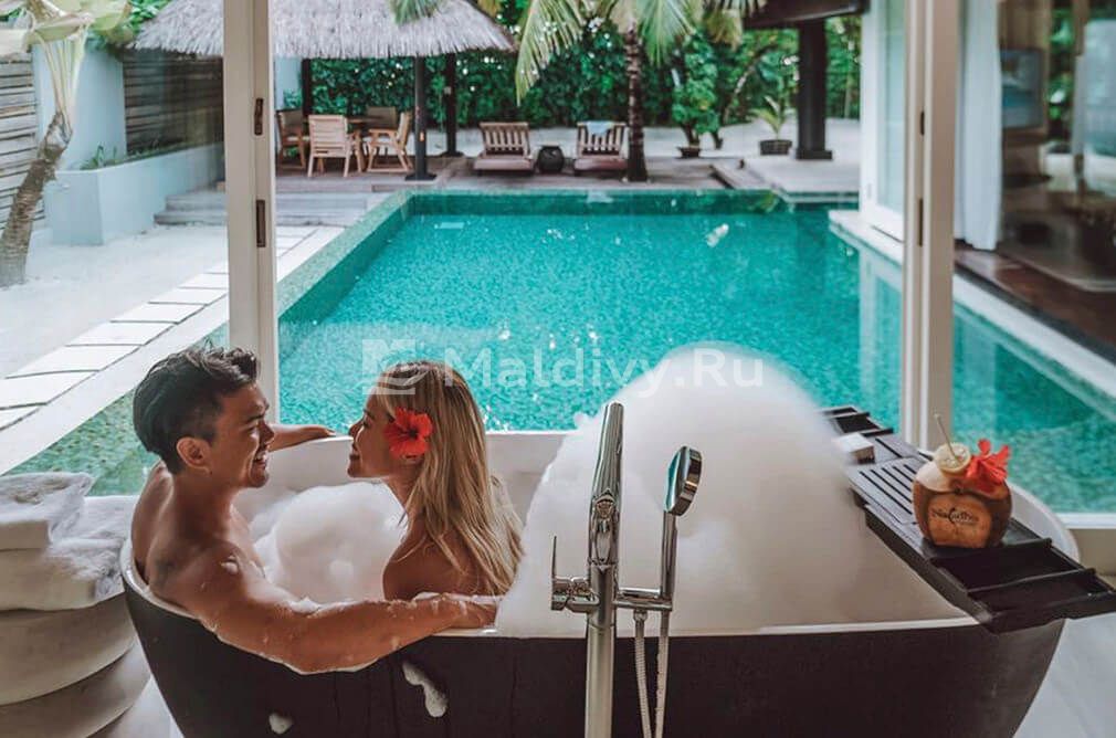 Впрочем, можно не искать живописные локации, а устроить романтический ужин в формате In-Villa Dining. В этом есть множество преимуществ, ведь буквально рядом будет благоухать ванна с ароматной пеной и цветами, из которой можно переместиться прямо на королевское ложе. Пусть ваша любовь станет на Мальдивах еще более нежной и страстной!