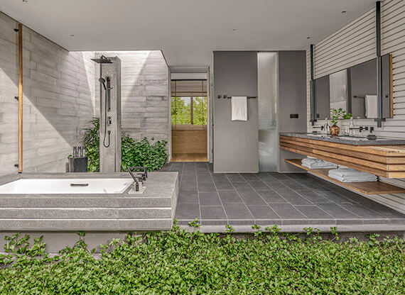 Вилла включает два жилых помещения: просторную светлую спальню и стильную гостиную. За спальней располагается изолированный санузел и невероятная полуоткрытая ванная комната, выходящая в приватное патио. Гостиная дополнена просторной террасой, примыкающей к пейзажному бассейну.