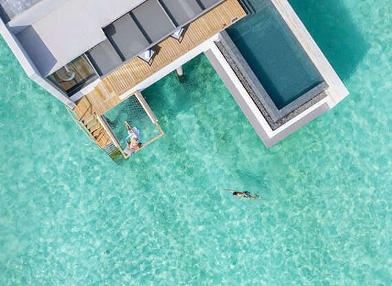 Жилое пространство элегантной Sunset Water Villa представлено просторной и светлой студией, совмещающей опции спальни и гостиной. Рядом расположена грандиозная ванная комната с панорамными окнами и отдельный туалет. Завершающий штрих – дощатая терраса с зонами отдыха, надводной сеткой и бассейном.