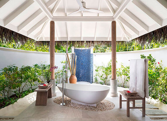 Планировка элегантной Sunset Beach Villa построена вокруг просторной спальни с кроватью king-size. За ней располагается очень просторная гардеробная, а далее – полуоткрытая ванная, органично перетекающая во внутренний дворик, отороченный зеленью. Выход к идиллическому пляжу предвосхищается просторной террасой с зонами для отдыха и трапез.