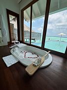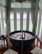 Вилла потрясающая! Особенно впечатлила круглая ванна во дворике. Дворик залит водой, на стене как водопад, очень атмосферно. Рестораны прекрасные все. Бармен Алексей выше всяких похвал. Самые яркие впечатления оставило теппаньяки в Fire и подводный Sea. Хотелось бы конечно порции побольше на фуллборде, но мы просто очень любим покушать.