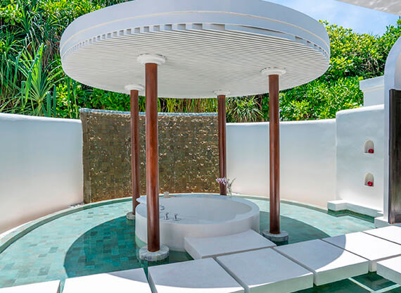 В планировку Three Bedroom Beach Pool Residence входит три фантастических гостевых сьюта: два king-size и один twin. Каждый сьют располагает полным спектром вспомогательных помещений: по две гардеробных комнаты, душевые в помещении и на открытом воздухе, санузлы. В затопленных патио располагаются восхитительные ванны. Терраса, сообщающаяся с обширным инфинити-бассейном с джакузи, разбита на множество рекреационных зон. Имеется зона барбекю и павильон для трапез.