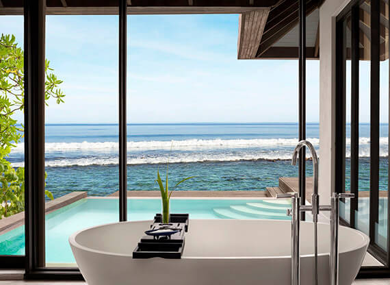 Роскошная Ocean Pool Villa – весьма удачная архитектурная композиция, построенная вокруг грандиозной спальни. В нее входит шикарная ванная с панорамным видом на прибой и океан, душевая и санузел, просторная гардеробная. Еще одна душевая приютилась в уединенном патио. Навстречу океану выступает обширная зонированная терраса, дополненная инфинити-бассейном.