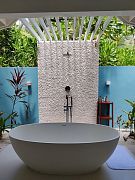 Еда – просто умопомрачительная. Вилла не очень большая, но интересная. Все исправно работает. Как-то возникла проблема с душем, так починили за полчаса. Кстати, ванна в саду – отдельное удовольствие. Она большая, мы с малой плескались вдвоем без проблем.