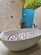 Виллы очень элегантные, как будто ты на Ривьере. Все подобрано идеально: роскошная косметика, полотенца, халаты. Очень комфортная кровать, ванна в саду, достойный пляж. Все твои желания ловят налету. Евгения, ты наш добрый ангел!