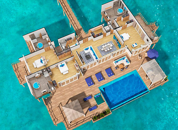 Планировка фантастической Grand Baglioni Maldives Villa включает три великолепных сьюта с просторными спальнями и люксовыми ванными, грандиозную гостиную-столовую и даже уютную комнату для персонала. Дополнение в виде огромной террасы с зонами для релакса, трапез и спа-процедур, а также впечатляющий пейзажный бассейн, ставят флагманскую Grand Baglioni Maldives Villa в ряд лучших резиденций на Мальдивах.
