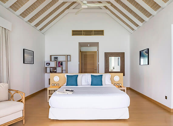В центре планировки очаровательной Sunset Water Villa лежит стильная спальня с панорамными окнами-дверями в пол. К ней прилагается просторная ванная комната с роскошной ванной, изолированный туалет, душевая и гардеробная (рядом со входом). Великолепная солнечная терраса, с которой открывается вид на закат, дополнена комфортным спуском в бирюзовую лагуну.