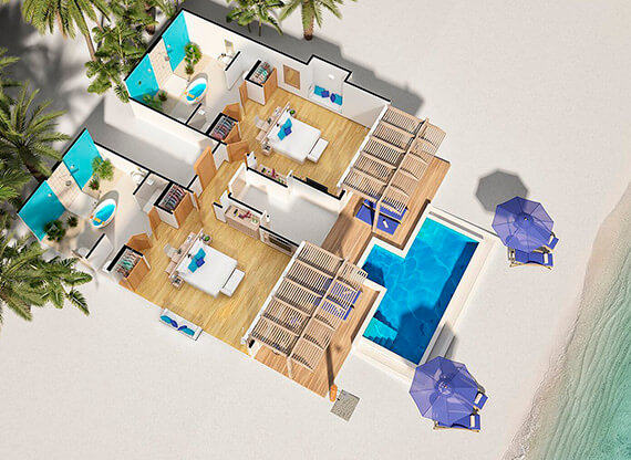Роскошная Two Bedroom Family Beach Villa with Pool – дуэт двух великолепных сьютов, идентичных как по метражу, так и наполнению. Две просторные спальни дополнены ванными комнатами, плавно переходящими в уединенные патио с тропическими душами, и полным комплектом вспомогательных помещений. К вилле примыкает просторная дощатая терраса, а также достаточно большой и глубокий бассейн.
