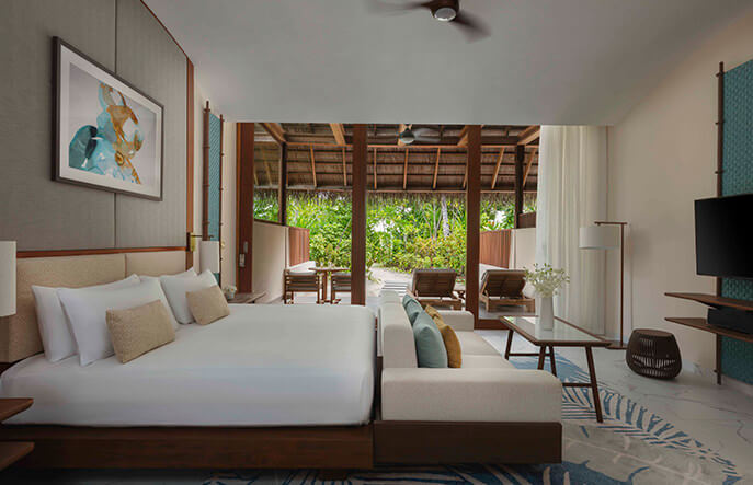 Береговое размещение в Conrad Maldives Rangali Island возможно только на активном острове Рангали-Финолу. Здесь представлены как уютные однокомнатные бунгало в аутентичном стиле, так просторные резиденции с 2–3 спальнями. Все виллы имеют прямой доступ к пляжу, меблированные террасы и особую фишку – просторные патио с садами, тропическими душевыми и зонами отдыха. Большинство номеров (кроме категории Beach Villa) дополнены приватными бассейнами.