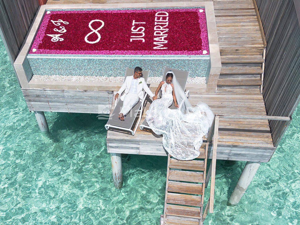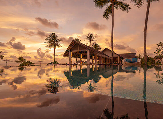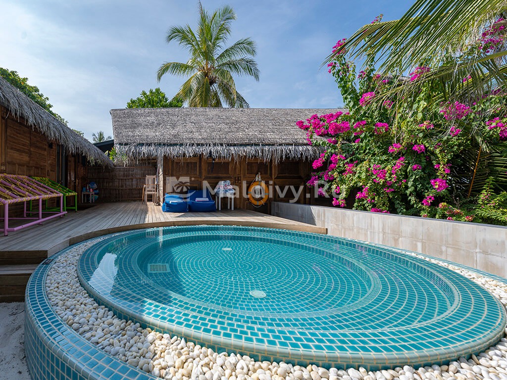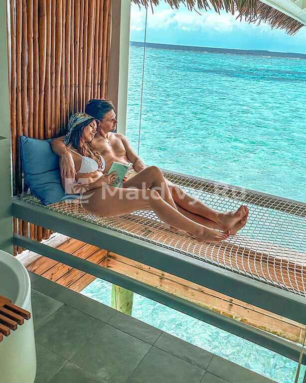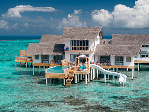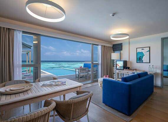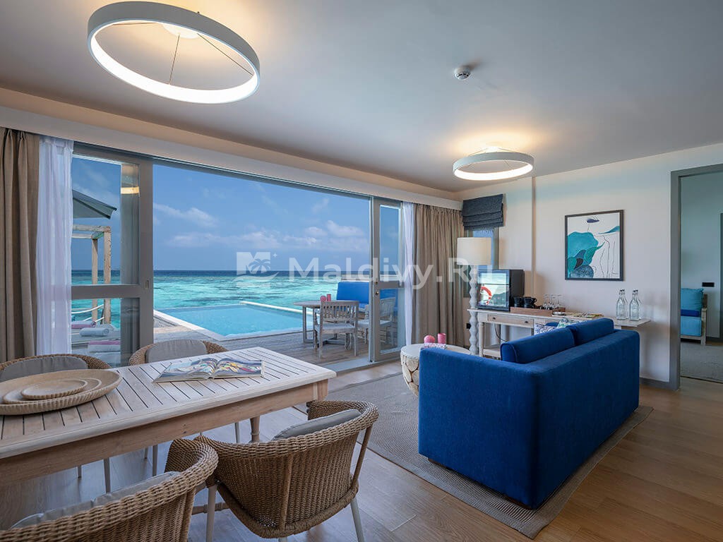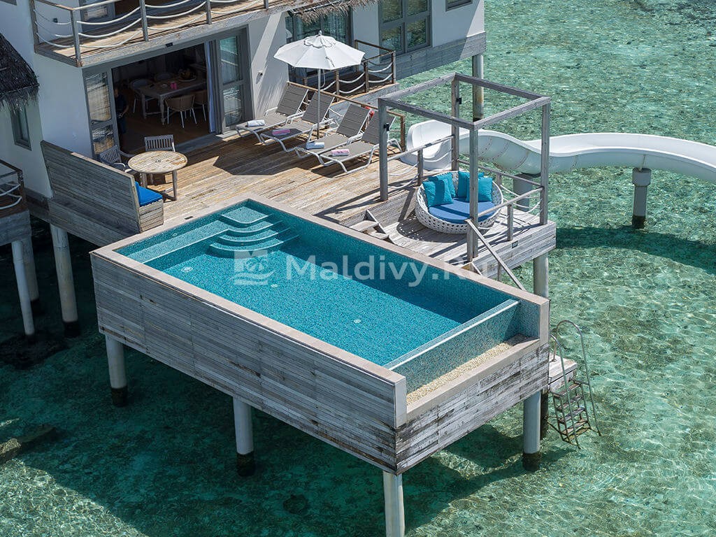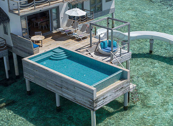Two Bedroom Lagoon Pool Villa with Slide – эталон надводного размещения от Cora Cora. Две роскошные спальни, просторная гостиная, множество зон для релакса и трапез, впечатляющий пейзажный бассейн, вид на закат. Эксклюзивная изюминка – водная горка.