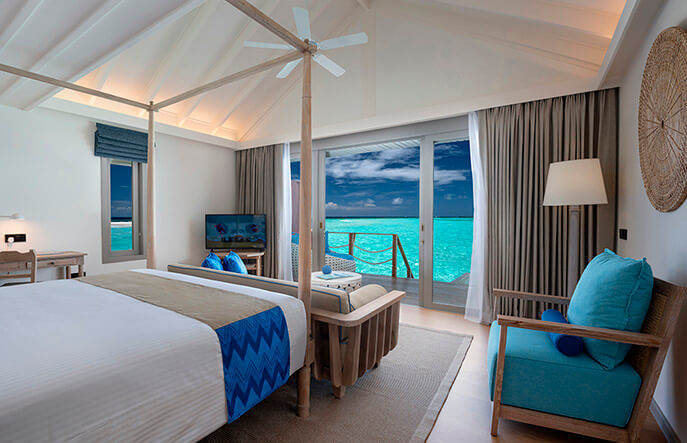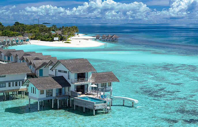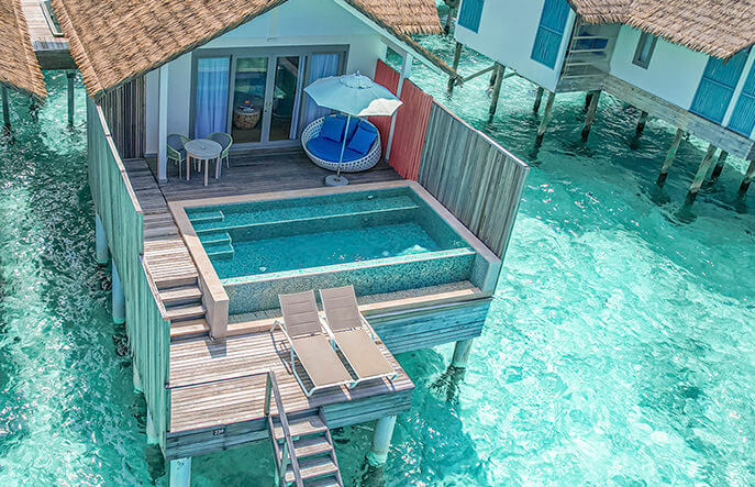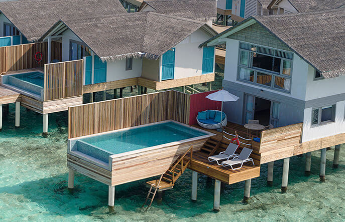 Изящно изогнутая локация надводных вилл Cora Cora Maldives примыкает к северо-западному побережью Маамигили и простирается на запад, далеко в океан. Элегантные бунгало воплощают собой эталон приватности и романтики. Взыскательные пары могут обратить внимание на двухуровневые Duplex Lagoon Pool Villa с просторными пейзажными бассейнами, а фантастическая Two Bedroom Lagoon Pool Villa with Slide с лихвой удовлетворит самые высокие запросы. Дополнительный бонус – потрясающий вид на легендарные мальдивские закаты.