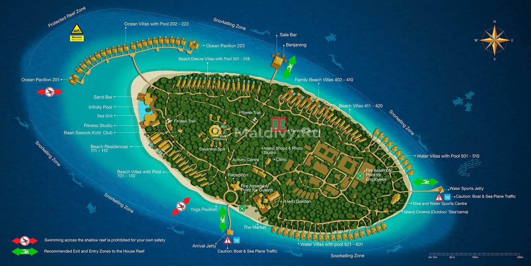 Dusit Thani Maldives расположился на природном острове Мудду, что в атолле Баа (северная часть Мальдив). Неподалеку находится легендарная Ханифару-бей с гигантскими мантами и китовыми акулами. Расстояние от Мале составляет порядка 123 км, которые гидроплан преодолевает буквально за 35 минут. У отеля есть фирменный лаунж, где гости ожидают трансфера с максимальным комфортом.
