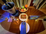 Два раза заказывали завтрак в бассейн, очень вкусно. Особенно под шампанское. Фрукты в номере были каждый день. На годовщину специально для нас испекли юбилейный торт, украсили номер.