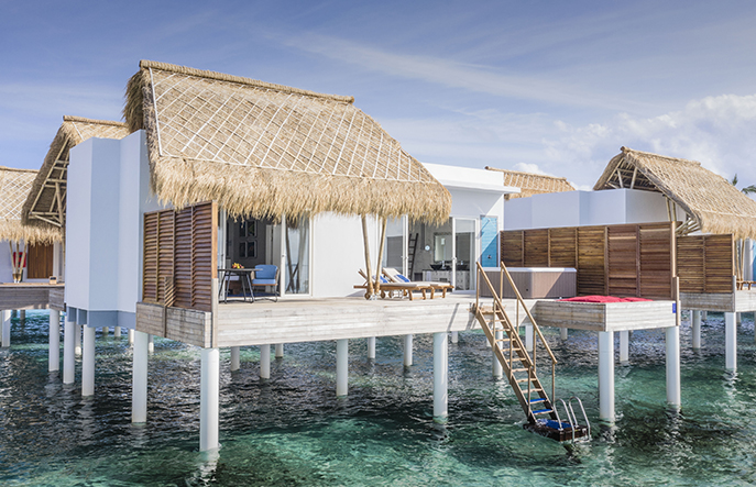 Изящная ветвь надводных вилл Emerald Maldives Resort & Spa, украшающая безупречную лагуну, примыкает к острову с западной стороны, что обеспечивает вид на потрясающий мальдивский закат. По одну сторону пирса расположены виллы с бассейнами, по другую – без них (некоторые с джакузи на террасе). Завершающим штрихом надводной локации служат роскошные Superior Water Villa with Pool и Presidential Water Villa со стильными гостиными, просторными террасами, газебо с качелями, инфинити-бассейнами и прочими атрибутами дольче вита.