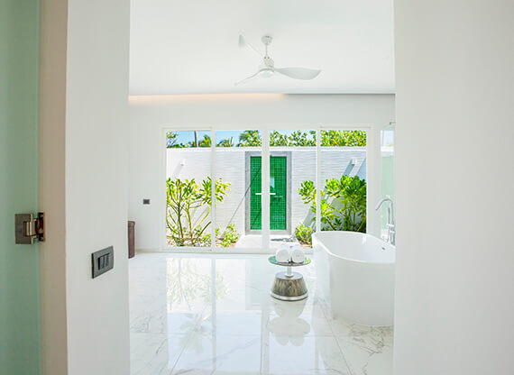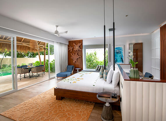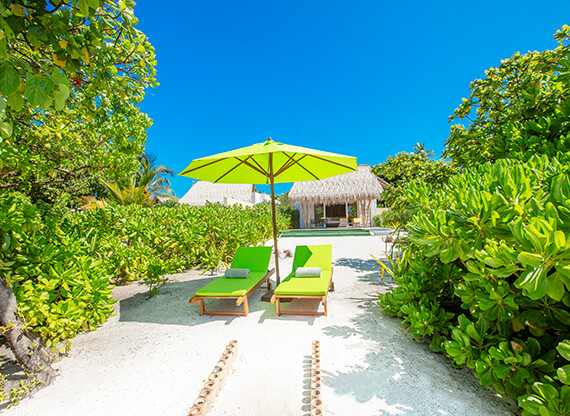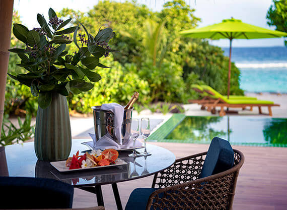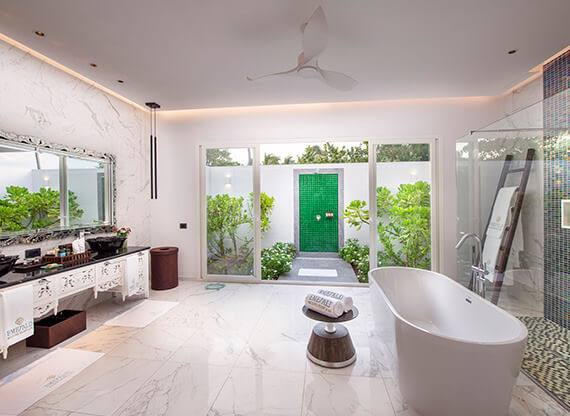 Очаровательная Marina Garden Villa with Pool (Вилла в саду у марины с бассейном) – воплощение средиземноморской элегантности от Emerald Maldives Resort & Spa, пренесенное на райские тропические острова. Виллы этой категории расположены у причала для яхт и гидросамолетов, поэтому не имеют собственного пляжа: до него нужно пройти «целых» 20 метров. Но это дает возможность забронировать восхитительную береговую виллу с полноценным приватным бассейном по весьма привлекательной цене, а до пляжа можно и прогуляться.