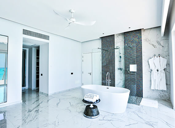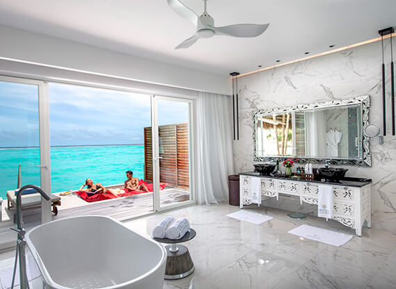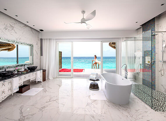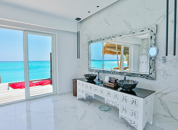 Сердцем Water Villa является просторная светлая спальня с раздвижными стеклянными дверьми. К ней примыкает ванная комната, практически не уступающая по размеру. В ней установлена полноразмерная ванна, душевая кабина и двойной туалетный столик. Гардеробная и туалет занимают отдельные помещения. Внушительная терраса дополнена зонами для отдыха и трапез, тропическим душем, надводной сетью и комфортным спуском в воду.