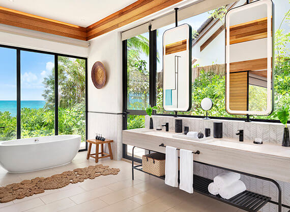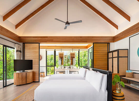 Роскошная Two Bedroom Beach Pool Villa представляет собой композицию из двух идентичных сьютов, объединенных великолепной гостиной. Во второй спальне может быть установлена двуспальная кровать или твин – по желанию гостей. Приятным дополнением является комната для персонала с собственной ванной. Все это венчается просторной террасой с зонами для трапез и релакса, к которой примыкает большой инфинити-бассейн.