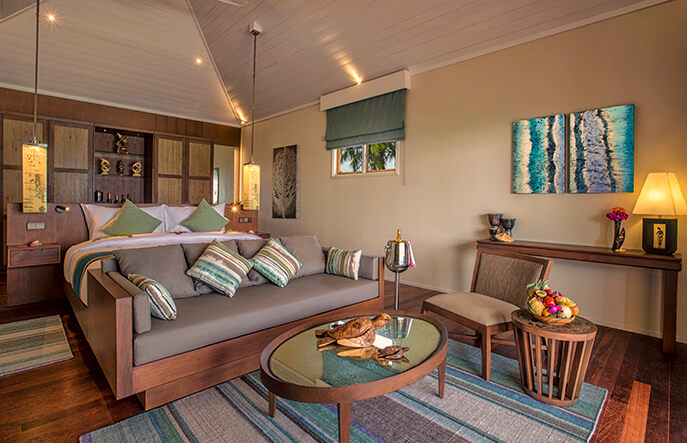 Две трети номерного фонда отеля расположено над водой. Это 60 традиционных бунгало на сваях в трех категориях, мало чем различающихся по конфигурации и дизайну. Базовыми являются Ocean Villas. Очаровательные Romantic Ocean Villas отличаются от них лишь наличием надводной сети, ванны на террасе и вида на закат, а Ocean Pool Villas – приятным дополнением в виде приватного инфинити-бассейна.