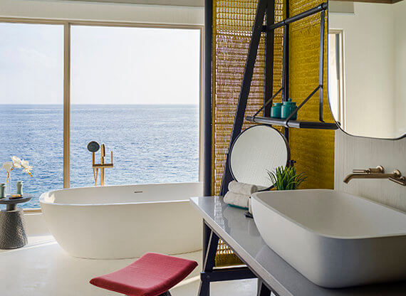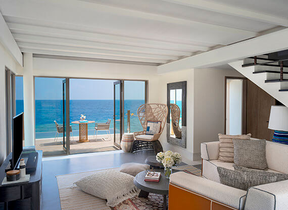 Элегантная One Bedroom Sunset Lagoon Pool Villa – аутентичный двухэтажный особняк с локацией в лагуне, но на собственном пляже. Первый уровень оккупировала восхитительная гостиная с окнами-дверьми в пол, прилегающей душевой и туалетом. Шикарное дополнение – инфинити-бассейн над океаном.