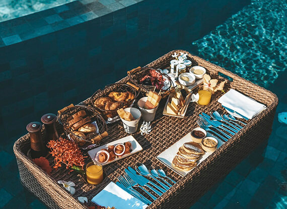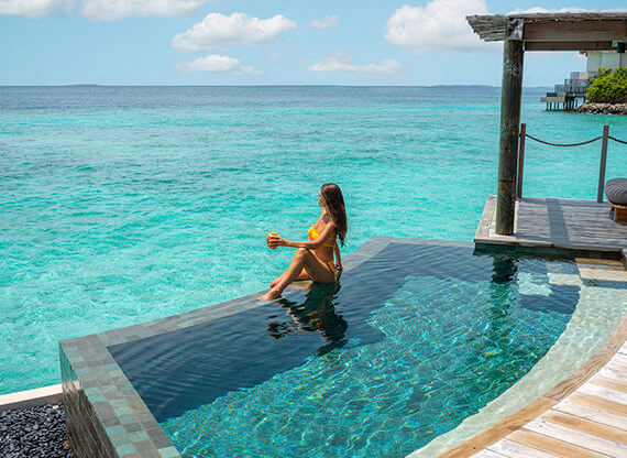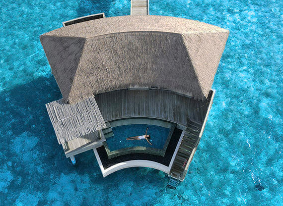 Очаровательная Overwater Pool Villa представляет собой элегантную композицию из просторной спальни-студии и комплекса вспомогательных помещений: просторной ванной комнаты, гардеробной, изолированного санузла и душевой. Вилла дополнена просторной террасой и оригинальным инфинити-бассейном прямоугольной формы.