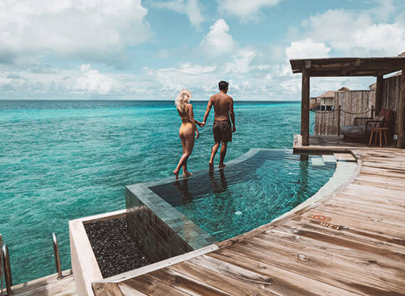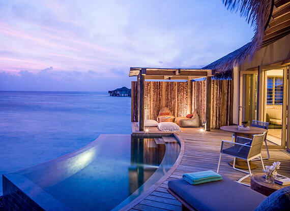 Перед вами стильная Sunset Overwater Pool Villa (Вилла над водой с бассейном и видом на закат) – эталонное надводное бунгало от InterContinental Maldives Maamunagau. Она возвышается на сваях над лазурью идиллической лагуны, очаровывая роскошным наполнением и потрясающим видом на закат над океаном.