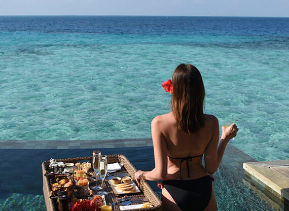 Сердцем роскошной Sunset Overwater Pool Villa является изысканная спальня-студия, обрамленная полным спектром вспомогательных помещений: просторной ванной, вместительной гардеробной, туалетом и душевой. Внешнее оформление не менее великолепно: зонированная терраса с кабаной для отдыха, солярием и обеденной зоной, а в качестве десерта – вид на закат!