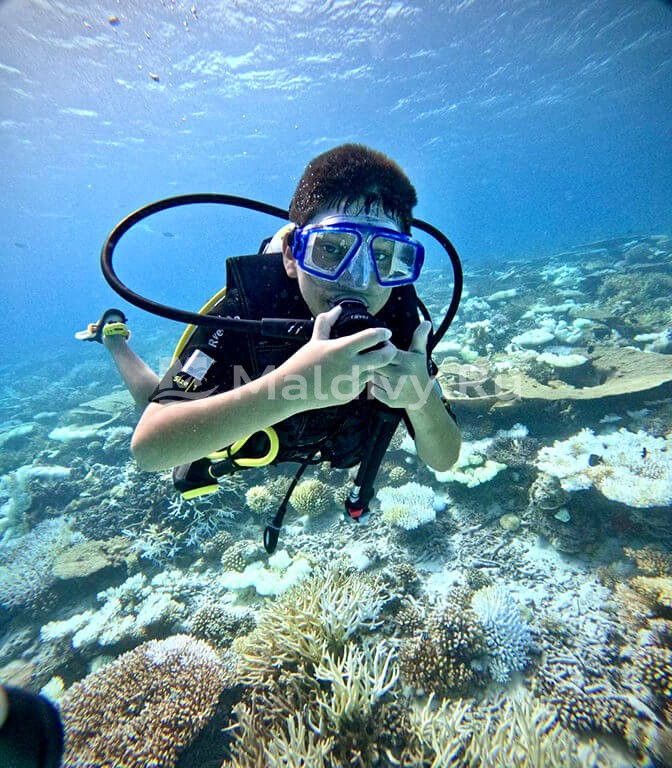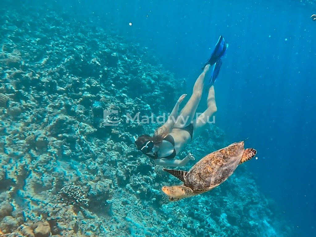 Домашний риф Joy Island Maldives доступен как с берега, так и ветви надводных вилл. Снаряжение для снорклинга и спасательные жилеты выдаются бесплатно, точки доступа имеются, так что вполне можно плавать на рифе самостоятельно. Пока его не назовешь одним из лучших на Мальдивах, но для новичков впечатлений будет масса. Опытные снорклеры могут отправиться в групповой или приватный трип на более живописные коралловые рифы, поплавать с черепахами, мантами или добродушными акулами-няньками.