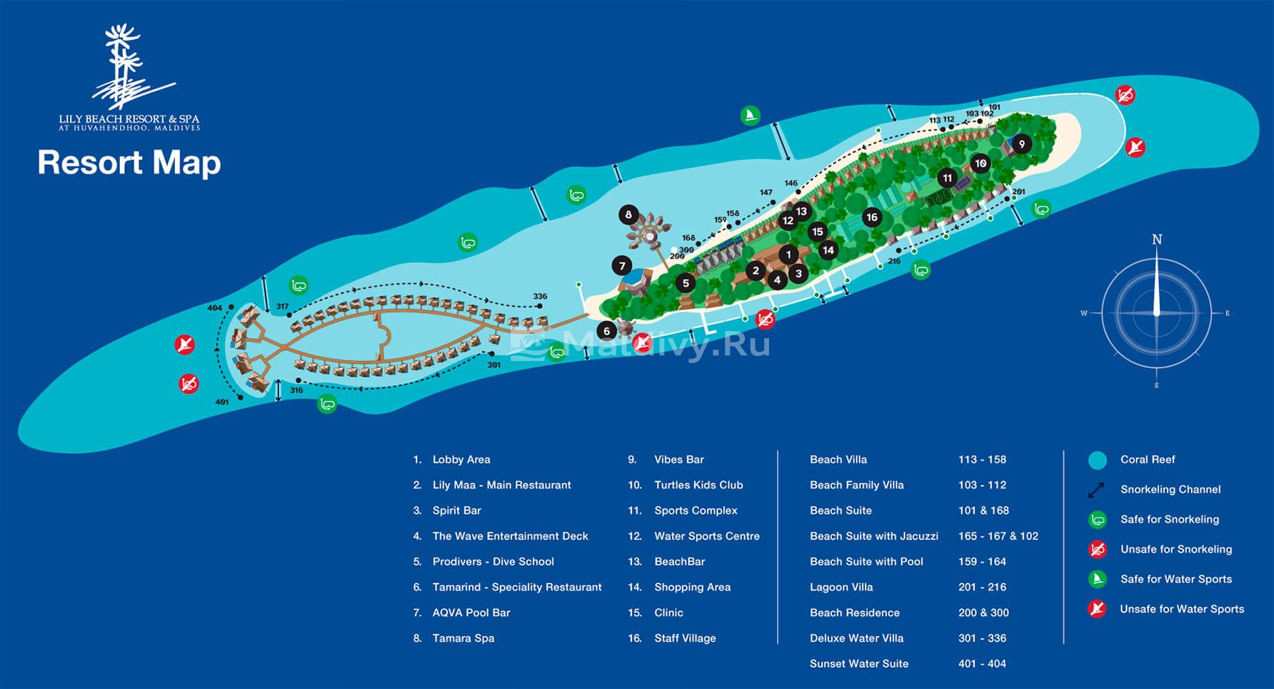 Остров Хувахенду, на котором расположился Lily Beach Resort & Spa, имеет средние, по местным меркам, размеры: 600 х110 м. Все береговые виллы получили доступ к пляжу, причем большинство их расположено на северном побережье острова, к которому примыкает локация Tamara Spa. Ветвь надводных вилл берет начало от западного побережья острова и простирается далеко в океан вдоль шикарного домашнего рифа. Отель располагает двумя большими бассейнами (клубным и семейным), классным детским клубом Turtle, органической фермой, многочисленными спортплощадками, центрами дайвинга и водного спорта и другими объектами инфраструктуры.