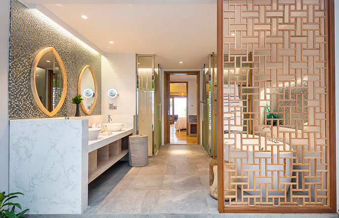 Кроме того, различается реализация ванных комнат. Виллы дополнены открытыми ванными комнатами с ваннами, душами и туалетами в патио. Сьюты имеют полуоткрытые ванные комнаты, изолированные санузлы и душевые кабины, а также просторные гардеробные. В патио находится тропический душ.
