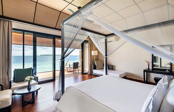 Восхитительные Lagoon Villa представляют собой сбалансированный компромисс между пляжным и надводным размещением. Уединенные дуплексы имеют входы со стороны сада, но террасы нависают над идиллической лагуной. Во время отлива берег обнажается – и в распоряжении гостей оказывается собственный участок пляжа. Просторная светлая спальня, терраса с шезлонгами, уютное патио с ванной-джакузи – дивные Lagoon Villa подходят как для семейного, так и романтического отдыха.