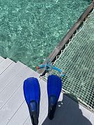 Уровень воды возле водных вилл небольшой, особенно в отлив. Поэтому нужно отплывать подальше. Лучший снорк – возле центра дайвинга. Кстати, там можно взять маску и ласты бесплатно.
