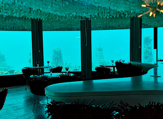 Ресторан Subsix – подводное святилище гастрономии, расположенное на глубине 6 метров, на роскошном рифе Niyama Private Islands Maldives. Насладитесь изысканными блюдами из рыбы и морепродуктов, пока мимо проплывают мавританские идолы, рыбы-попугаи, мурены, рыбы-бабочки и черепахи. Позвольте себе отведать кулинарные шедевры на основе икры, запив их утонченными винами. А раз-два в неделю здесь устраивают уникальные Glow party на фоне рифов, где зажигают ди-джеи с мировыми именами – такие вечера нельзя пропускать!