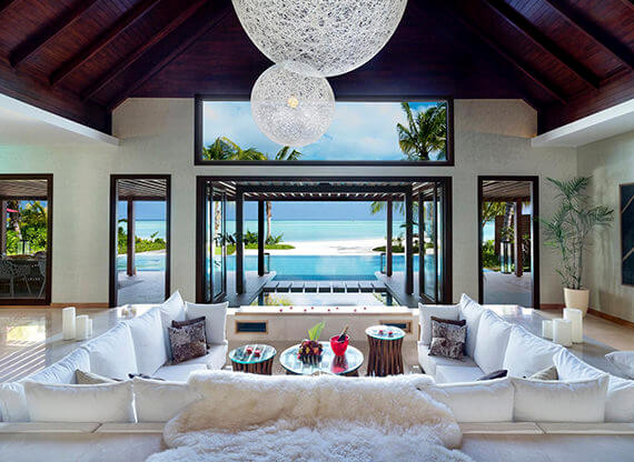 Внутренняя планировка Three Bedroom Beach Pool Pavilion включает три роскошные спальни (2 king-size, 1 twin). В распоряжении гостей две просторные ванные комнаты, сообщающиеся с приватными патио с тропическими душевыми, 4 санузла, собственный спа-кабинет и грандиозная гостиная-столовая. К резиденции примыкают два инфинити-бассейна (больший – с зоной джакузи), зонированные террасы, пышный тропический сад и приватный пляж.