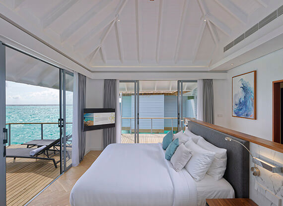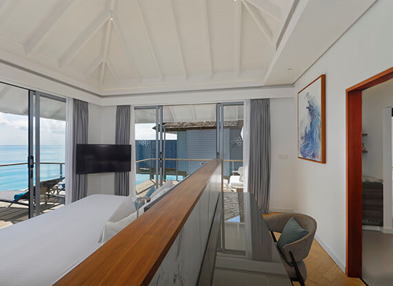 В центре планировки очаровательной Over Water Villa находится просторная светлая спальня с панорамными окнами-дверями. К спальне примыкает впечатляющая гардеробная, пройдя через которую вы попадете в восхитительную ванную, декорированную в тонах благородного мрамора. Вишенка на торте – просторная терраса с зонами для релакса и трапез, откуда открывается фантастический вид на океан.