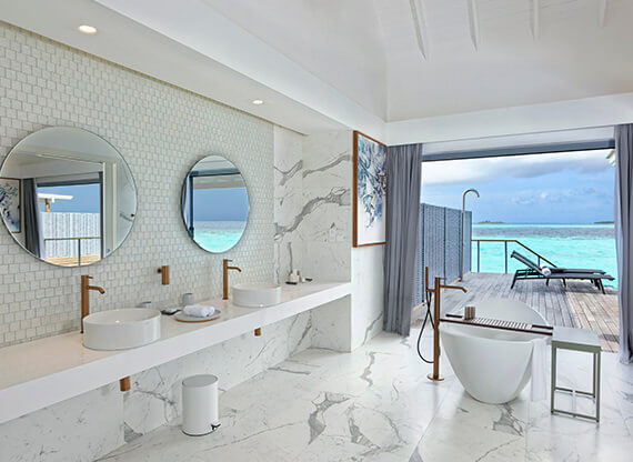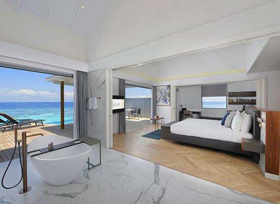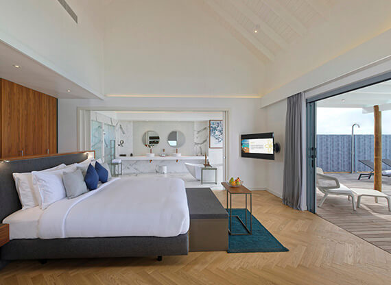 Роскошная Over Water Villa with Private Pool начинается со стильной спальни, отделенной от просторной ванной комнаты раздвижной перегородкой. Спальня и ванная имеют прямые выходы на террасу, дополненную просторным инфинити-бассейном. Предусмотрен комфортный спуск в лагуну, обеденная зона, солярий с шезлонгами и открытый душ.