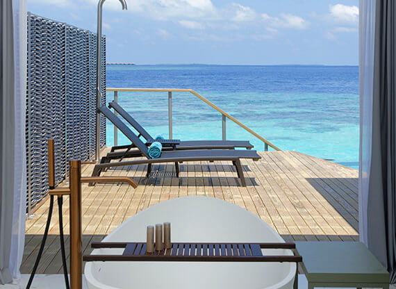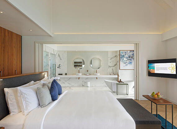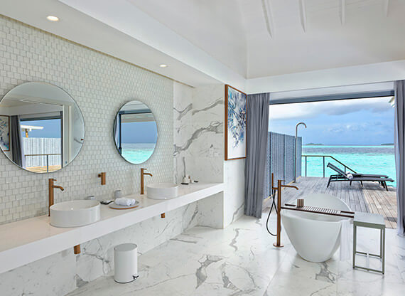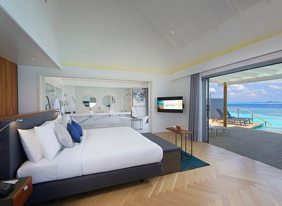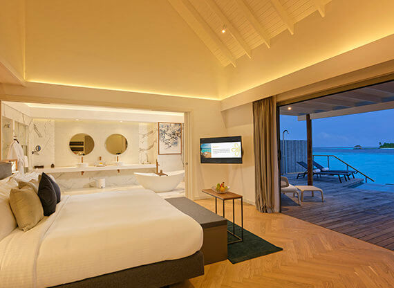 Планировка великолепной Sunset Over Water Villa with Private Pool включает просторную светлую спальню и беломраморную ванную, разделенные сдвижной перегородкой во всю стену. В наличии полный спектр удобств, включая изолированный санузел и душевую. Внешние дополнения не менее роскошны: терраса с солярием, обеденной зоной и открытым душем, а также достаточно большой инфинити-бассейн, нависающий над лагуной.