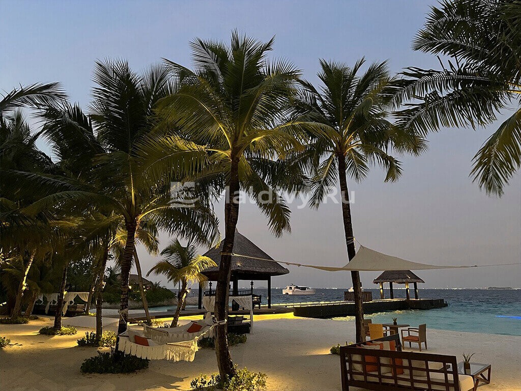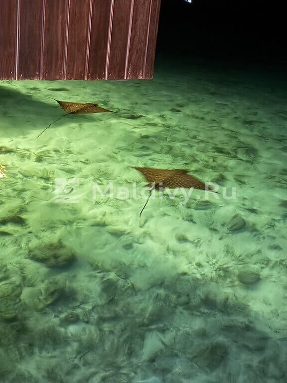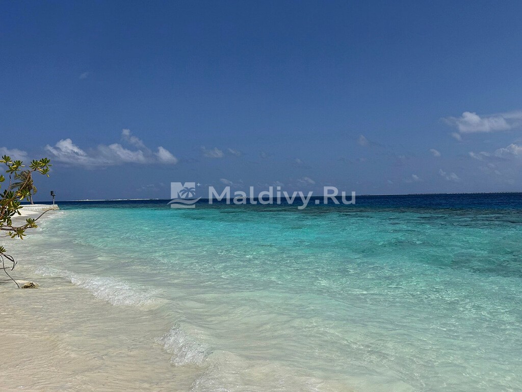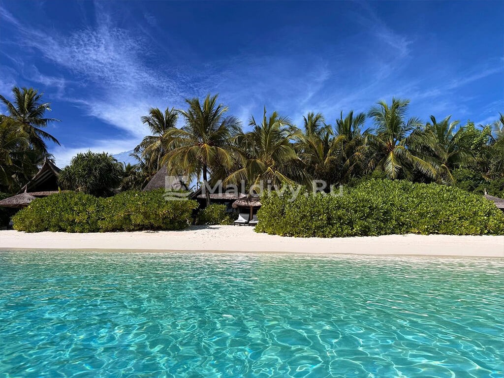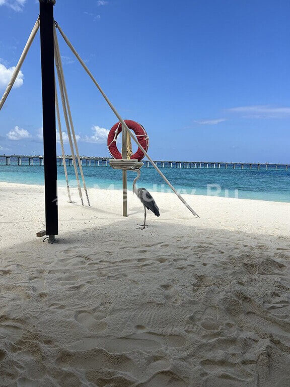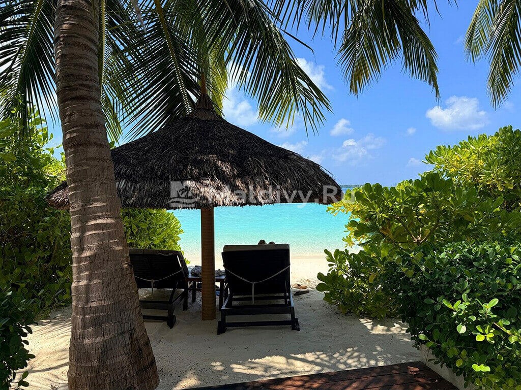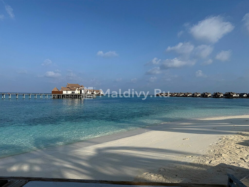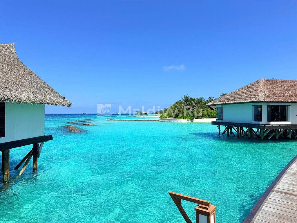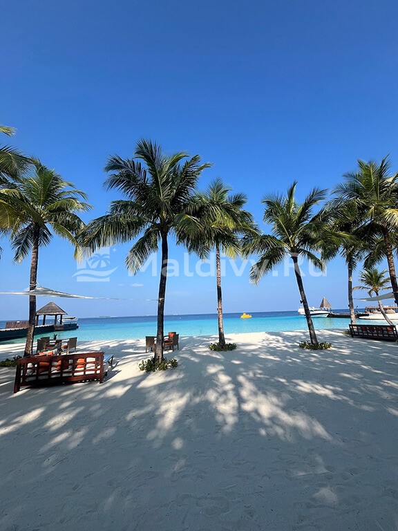 Остров достаточно большой, виллы красивые и очень просторные. Мы провели по 5 дней на пляже и над водой, в вилле с горкой. Единственный нюанс водной виллы – вдалеке видно Мусорный остров и Мале. Для кого это принципиально, оговорите при бронировании. Риф великолепный, не нужно ездить ни на какие экскурсии, все на месте – манты, черепахи, много рыбок. Скаты и акулы подходят прямо к берегу. Отличная еда и напитки, мини-бар – все входит в систему All Inclusive. Трансфер тоже бесплатный.