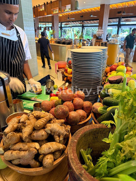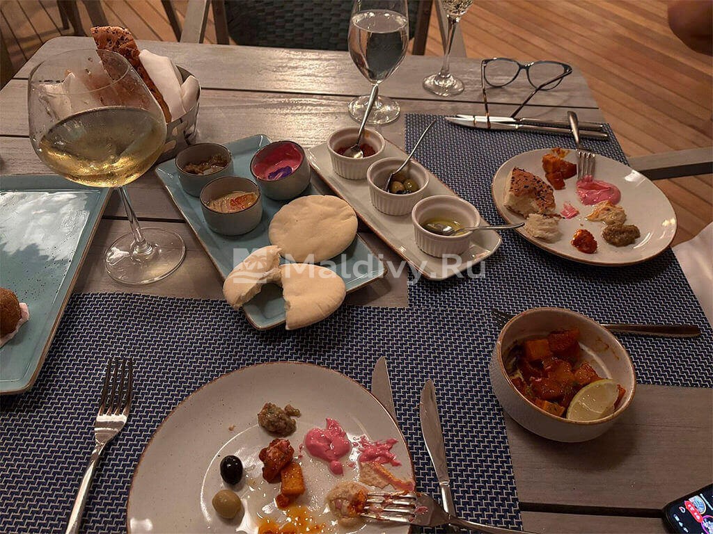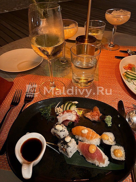 Еда невероятно качественная и очень разнообразная. На шведском столе были уголки кухонь разных стран. Очень много фруктов, хотя нам говорили, что на Мальдивах с этим проблема. В пятницу был большой мальдивский ужин с представлением. Это что-то невероятное!