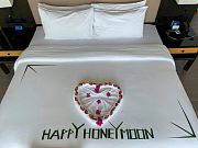 Это тот самый медовый месяц, о котором я мечтала! Настоящие Мальдивы, рай в стиле баунти! Нас встретили на причале гидросамолета, сразу отвезли на обед, потом на виллу. Она очаровательная! Ее так украсили к нашему приезду, а еще шампанское и фрукты!