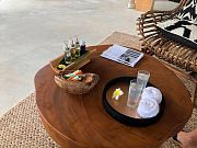 Мы отдыхали с детворой в 2-комнатной вилле с видом на закат. Очень понравилась стильная и пока еще не убитая отделка номера и мебель. Убирали 2 раза в день, приносили фрукты, десерты.