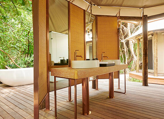 Safari Tent Villa with Pool – уникальная сафари-резиденция с роскошным наполнением. Она во всей красе воплощает идею глэмпинга: люксовый комфорт на лоне природы. Джунгли обступают просторный матерчатый шатер с просторной спальней, увенчанной кроватью king-size, уютной зонированной гостиной, грандиозной террасой и бассейном. Полуоткрытая ванная комната прилагается!