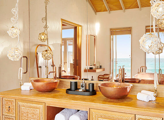 Three Bedroom Sunset Water Villa with Pool – роскошный комплекс из трех автономных вилл с аналогичным наполнением. Каждая имеет просторную спальню с двуспальным ложем королевских размеров, санузел и огромную ванную комнату с медной ванной, двумя умывальниками и душевой системой. Бунгало имеют общую террасу, но зона третьей вилы отделена деревянной стеной с дверью.
