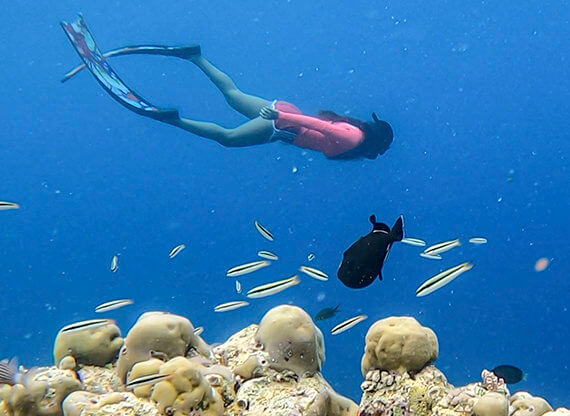 Живописный домашний риф Soneva Fushi идеально подходит для снорклинга. С западной стороны острова есть три удобных точки доступа к рифу – там можно не только поплавать в окружении ярких рыбок, но и повстречать дельфинов. При желании можно отправиться на снорклинг-сафари (в том числе, и на фантастической яхте Soneva in Aqua) или посетить знаменитую «станцию очистки» гигантских мант – Ханифару-бэй.