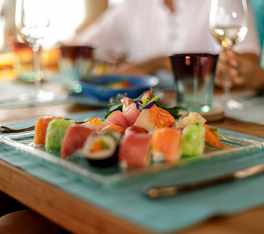 Ресторан Out of the Blue – грандиозный надводный комплекс, объединяющий несколько гастрономических концепций (в том числе, и одноименную). Красивейшие панорамы океана, свободная атмосфера и гармония с природой создают идеальное настроение для наслаждения шедеврами азиатской кулинарии. Здесь часто гостят и творят повара со звездами Мишлен, а выбор напитков и коктейлей – один из лучших на Мальдивах!