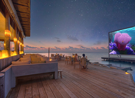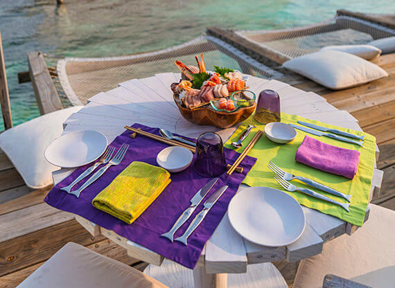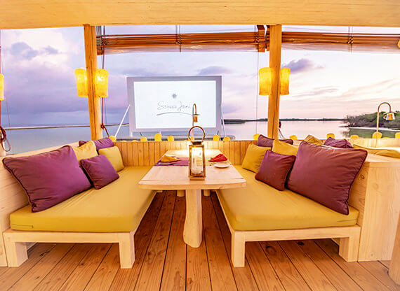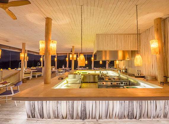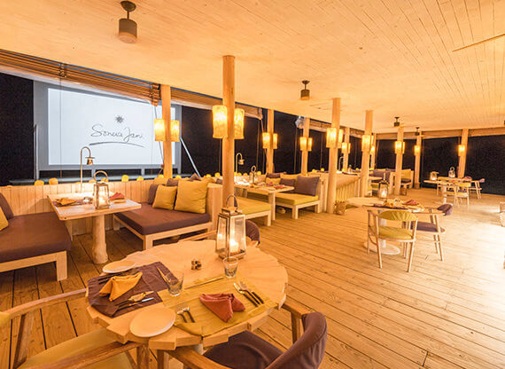 Ресторан Director’s Cut («Режиссерская версия») – утонченный альянс японских традиций и авторского фьюжн. Открытая кухня позволяет визуально насладиться искусством поваров Soneva Jani, а затем отведать изысканные плоды их труда на мягких диванах. Можно смотреть яркое кулинарное шоу или любимые всеми фильмы на грандиозном надводном экране, вдыхая дивные ароматы и запивая впечатления сакэ элитарных сортов!