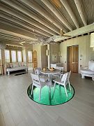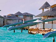 Мы остановились в водной вилле с горкой. Должен признать, что это самая впечатляющая вилла из всех, в которых я был. Курорт плавает над морем, включая помещения общего пользования (главный ресторан, спа-центр и т. д.). Остров, в отличие от Soneva Fushi, является вспомогательной частью курорта, поскольку практически вся движуха происходит на водной части.