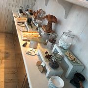 Экоконцепция отеля поддерживается во всем. Ручки у дверей и шкафчиков, столовые приборы и прочие металлические мелочи сделаны из переработанного металла. И это не поделки, а действительно произведения искусства. Посуду делают в собственной гончарной мастерской (можно сходить туда), а стекло отправляют на соседний «Фуши» – там его обрабатывают в специальной гласс-студии.