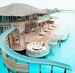 Приватные водные горки – одна из визитных карточек Soneva. Ими дополнены все варианты размещения, кроме Beach Hideaway. Надводные резиденции имеют горки, по которым можно съезжать с высоты второго уровня в бирюзовую лагуну. Горки при «сухопутных» виллах спускаются в просторные бассейны.