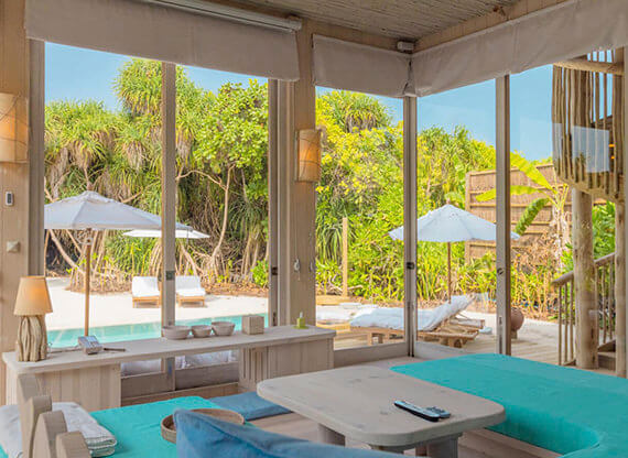 Beach Hideaway – роскошная двухуровневая резиденция с бассейном, отделенная от пляжа плотной, но неширокой полосой буйной растительности. Помимо легендарной сдвижной крыши и просторного бассейна, она может предложить паре или небольшой семье огромное жилое пространство, включающее спальню, гостиную, детскую, кладовую-кухню, джим, массу вспомогательных помещений и даже просторный йога-ретрит.